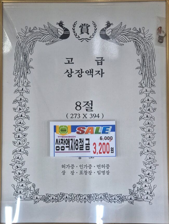 그런데 이 기사가 나간 후 어떤 분이 우연히 시내 생활용품점에 들렀다가 판매대에 봉황 테두리가 있는 상장을 발견했다며 그 사진을 제보해왔다. 액자포함 3,200원에 판매되고 있었다.