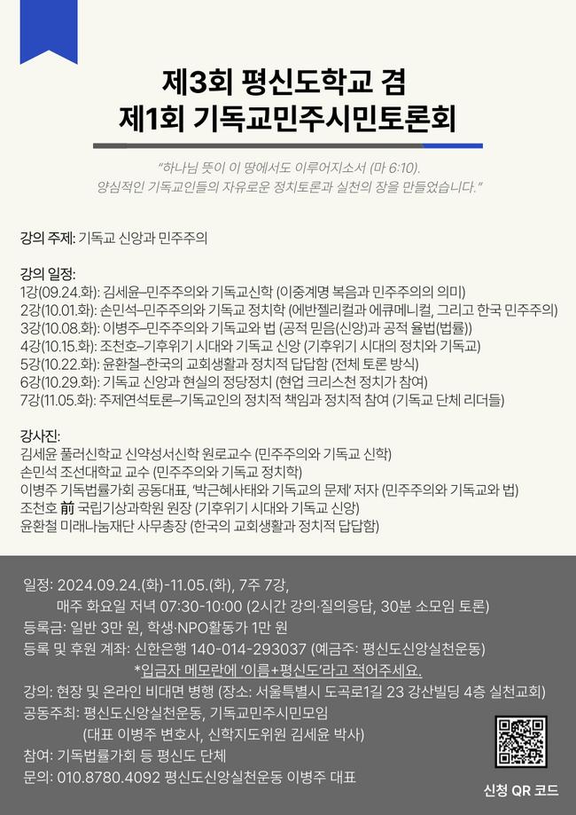 기독교 신앙과 민주주의의 관계에 대해 깊이 고민하고 토론하는 자리가 마련되었습니다! 평신도신앙실천운동과 기독교민주시민모임이 공동 주최하는 이번 행사는 깊이 있는 강의와 열띤 토론을 통해 기독교인의 정치적 책임과 참여에 대한 방향을 모색합니다. ♣ 주요 내용 강의 주제: 기독교 신앙과 민주주의 강의 일정: 2024년 9월 24일 ~ 11월 5일, 매주 화요일 저녁 7시 30분 ~ 10시 강사진: 김세윤, 손민석, 이병주, 조천호, 윤환철 등 각 분야 전문가 강의 방식: 현장 강의 및 온라인 비대면 병행 등록: 일반 3만 원, 학생/NPO 활동가 1만 원 (신한은행 140-014-293037, 예금주: 평신도신앙실천운동) 문의: 010-8780-4092 (평신도신앙실천운동 이병주 대표) ♣ 참여 대상 기독교 신앙과 민주주의의 관계에 대해 고민하는 모든 분 기독교인의 정치적 책임과 참여에 관심 있는 분 사회 변화를 위해 적극적으로 행동하는 기독교인 함께 만들어가는 민주 사회, 기독교인의 적극적인 참여를 기다립니다!