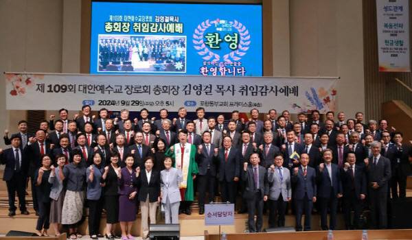 지난 9월 29일 오후 5시 포항동부교회에서 대한예수교장로회 통합총회 제109회 김영걸 신임 총회장 취임 감사예배를 드리고 있다. 단체 사진.