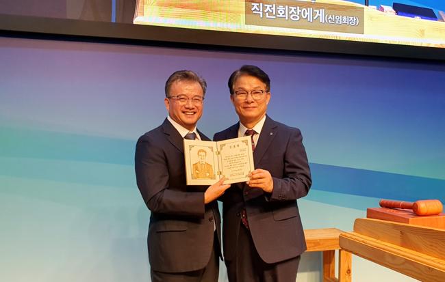 새로 동창회장이 된 오진홍목사가 직전 동창회장인 김태식목사에게 공포패를 수여