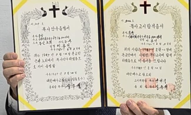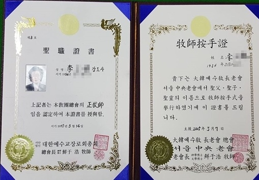 주범 이 씨가 허위로 발급 받은 대한예수교장로회총회 서울 중앙노회 목사안수증.