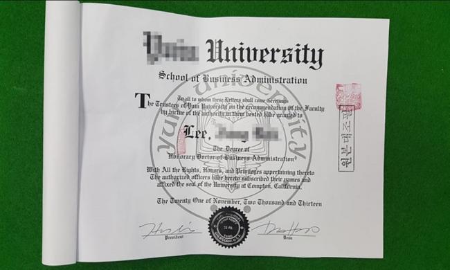 주범 이 모 씨의 이름이 적힌 미국 소재 대학교 경영학 명예박사학위. 이 씨가 약 2,200만원을 주고 제작을 의뢰한 것으로 조사됐다.
